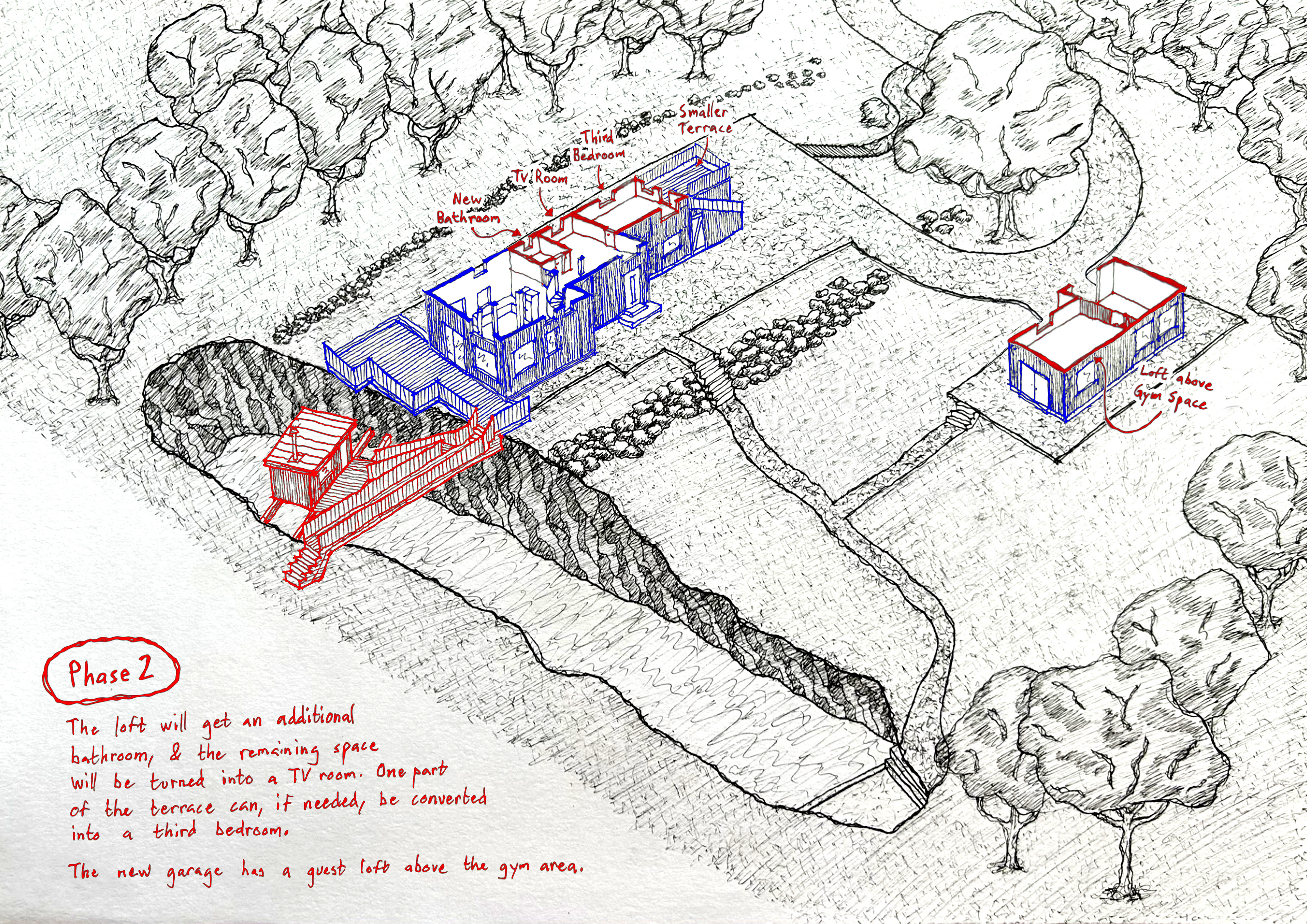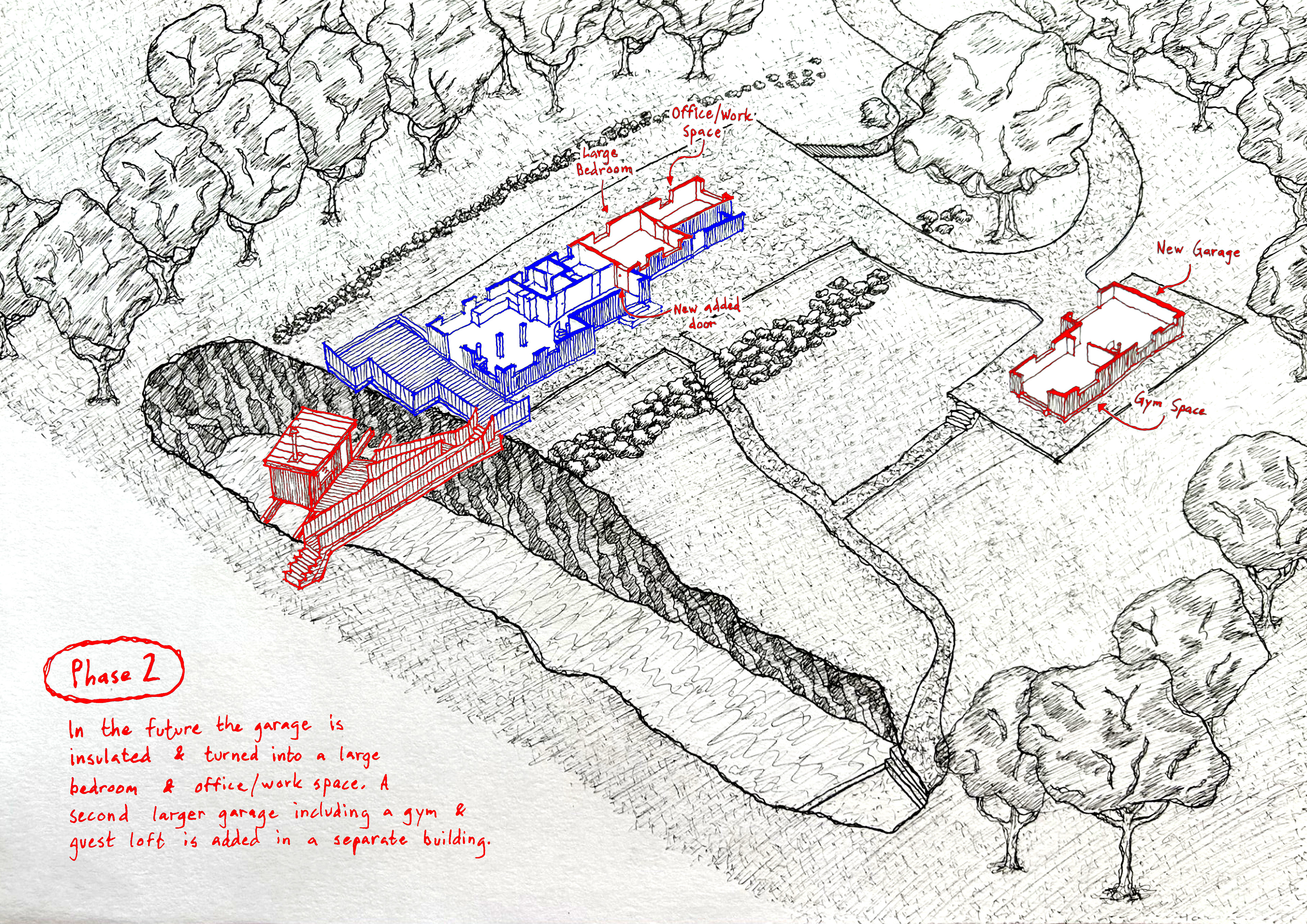 The existing garage is designed to evolve: in the second phase, it will be insulated and converted into a master bedroom and dedicated office. A new, separate structure will then be added to accommodate a larger garage and a gym — meeting future needs without disrupting the house’s overall composition.